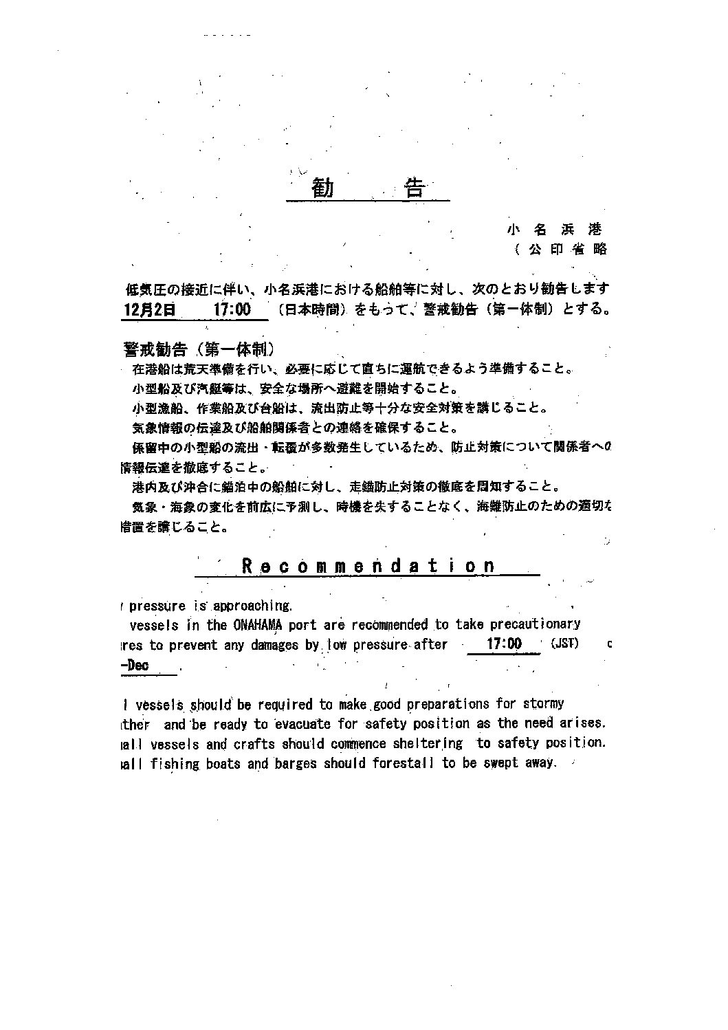 低気圧に伴う警戒勧告のお知らせ 2025.12.02 News 令和7年12月2日(火)より低気圧の接近による警戒勧告(第一体制)が発令されました。 海上や暴風による荒天にご注意ください。 今後の気象情報の留意をお願い致します。