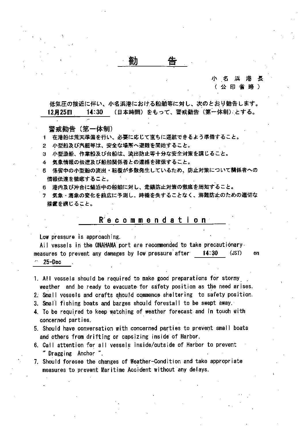 低気圧の接近に伴う警戒勧告のお知らせ 2025.12.25 News 令和7年12月25日(木)、低気圧の接近に伴い警戒勧告(第一体制)が発令されました。 海上や暴風による荒天にご注意ください。 皆様におかれましては今後の気象情報の留意をお願い致します。