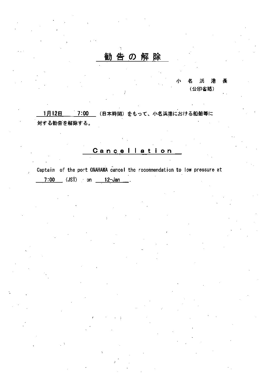 警戒勧告解除のお知らせ 2026.01.12 News 令和8年1月10日(土)に発令されていた警戒勧告が本日解除されました。 海上では強風が続いておりますので、皆様におかれましては引き続き安全対策や気象情報の留意をよろしくお願いいたします。
